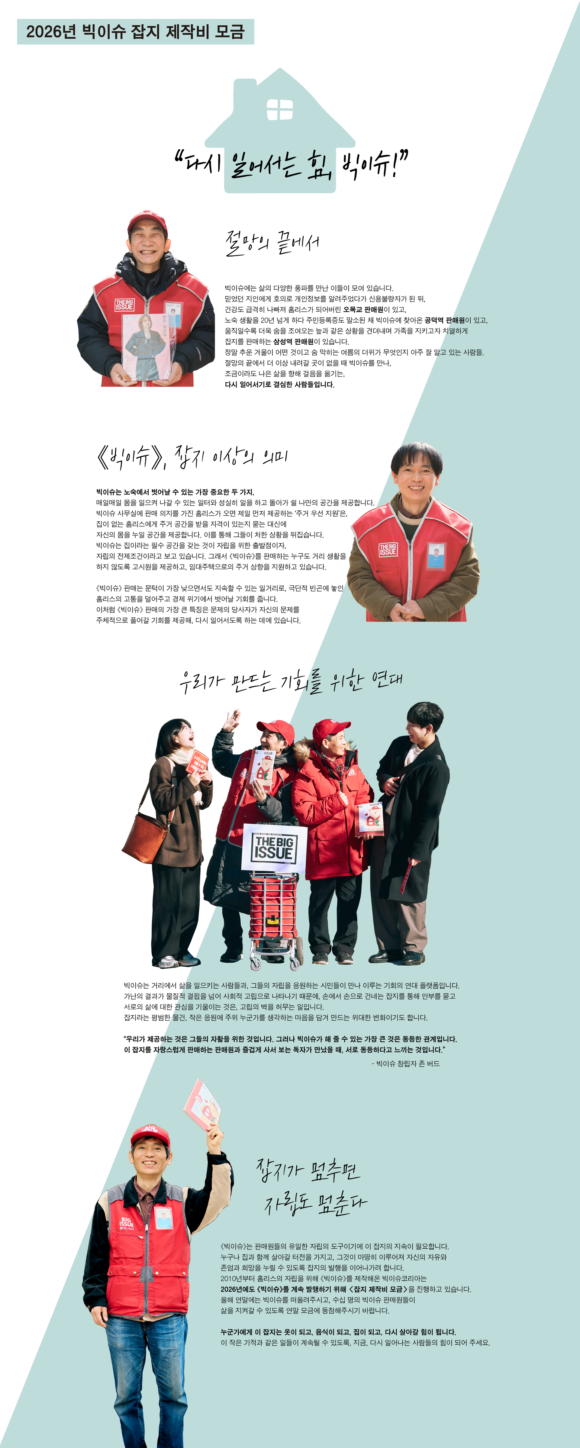 주거취약계층 판매원이 판매금의 절반(50%)을 가져갈 수 있는 매거진 《빅이슈》를 지속 발행하여 스스로 당당히 경제적 자립 활동을 할 수 있도록 돕습니다.